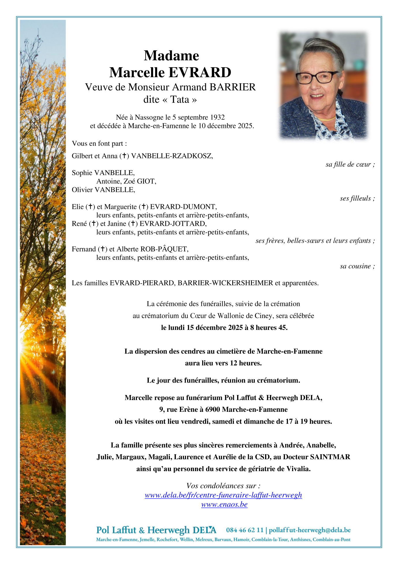 Décédé à Marche-en-Famenne (6900, Belgique) le mercredi 10 décembre 2025 à l'âge de 93 ans