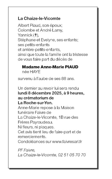 Fallecida en La Chaize-le-Vicomte (85310, Francia) el jueves, 4 de diciembre de 2025 a la edad de 87 años