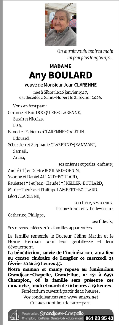 Décédée à Saint-Hubert (6870, Belgique) le samedi 21 février 2026 à l'âge de 79 ans