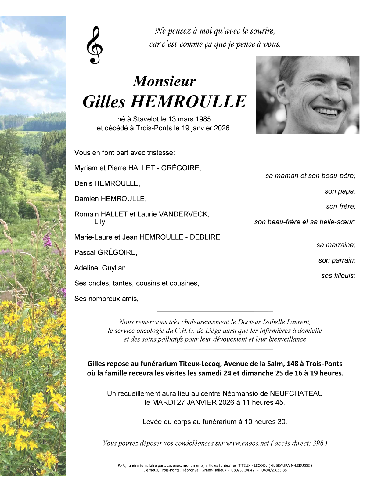 Décédé à Trois-Ponts (4980, Belgique) le lundi 19 janvier 2026 à l'âge de 40 ans