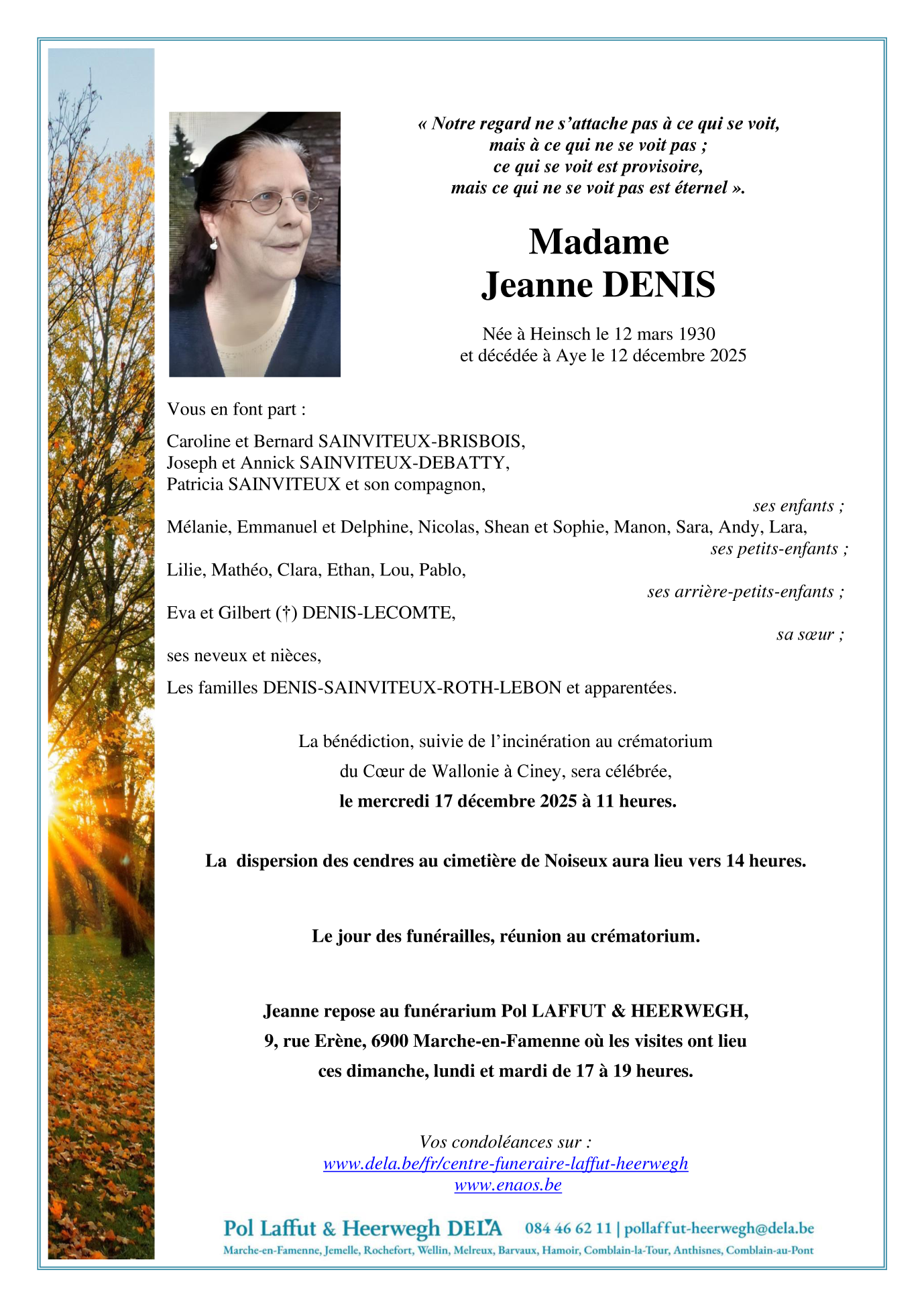 Fallecida en Aye (6900, Bélgica) el viernes, 12 de diciembre de 2025 a la edad de 95 años