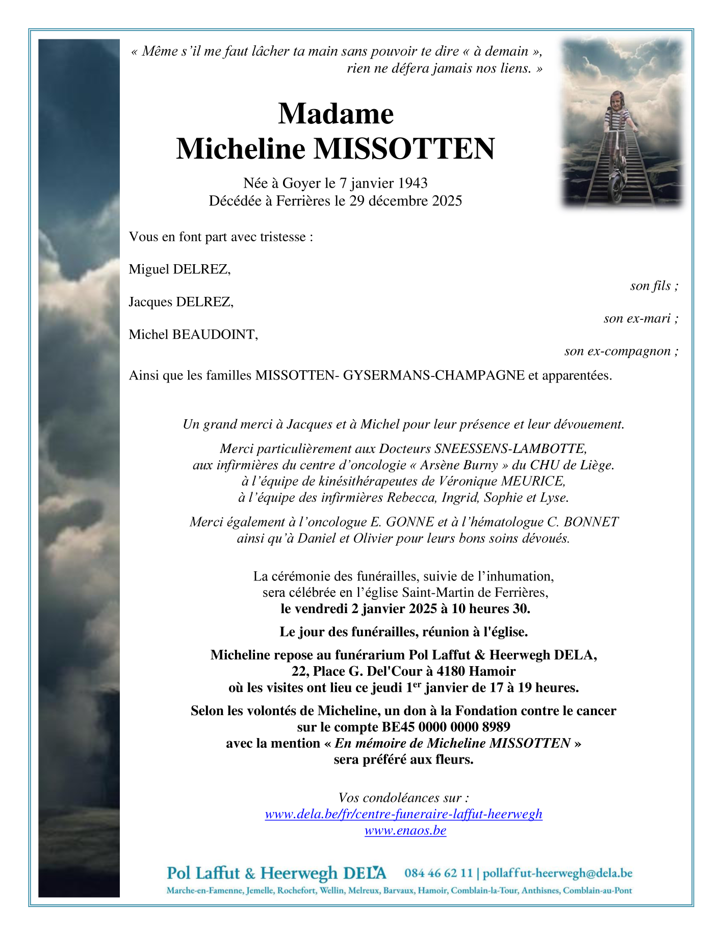 Fallecida en Ferrières (4190, Bélgica) el lunes, 29 de diciembre de 2025 a la edad de 82 años