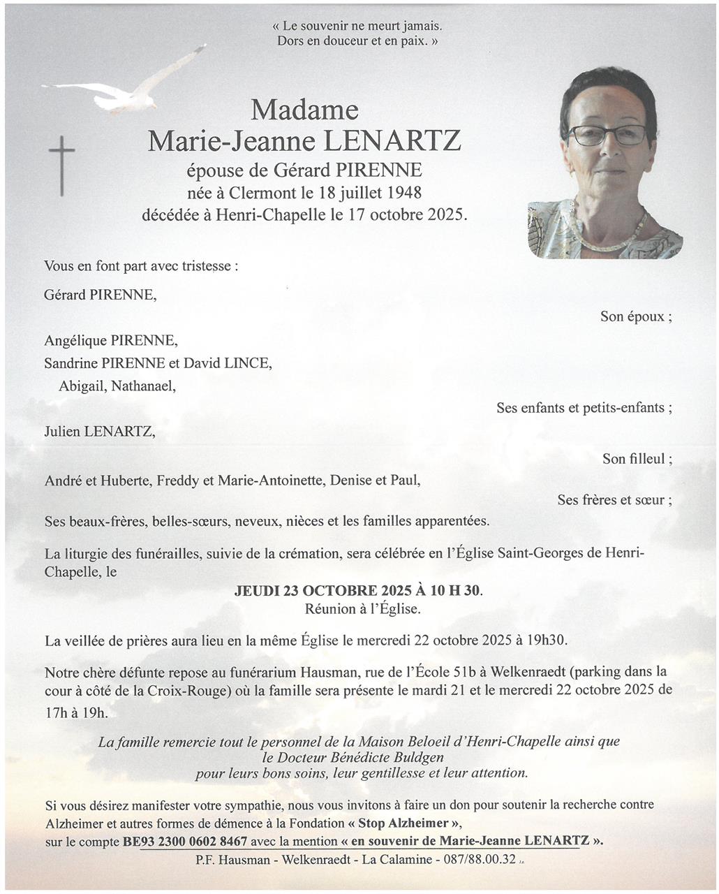 Fallecida en Henri-Chapelle (4841, Bélgica) el viernes, 17 de octubre de 2025 a la edad de 77 años
