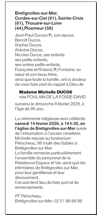 Madame Michelle DUCOS née POULAIN de la FOSSE-DAVID