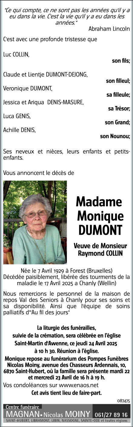 Weduwe van Monsieur Raymond COLLIN