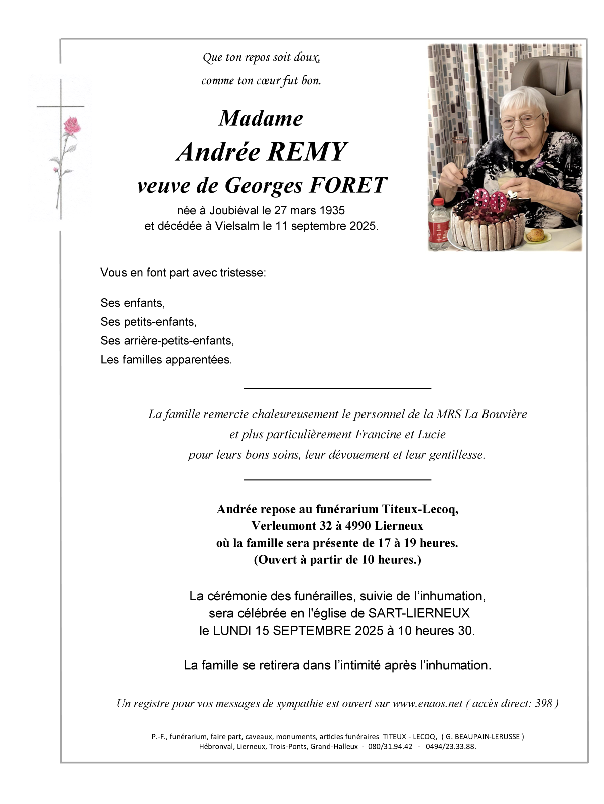 Décédée à Vielsalm (6690, Belgique) le jeudi 11 septembre 2025 à l'âge de 90 ans