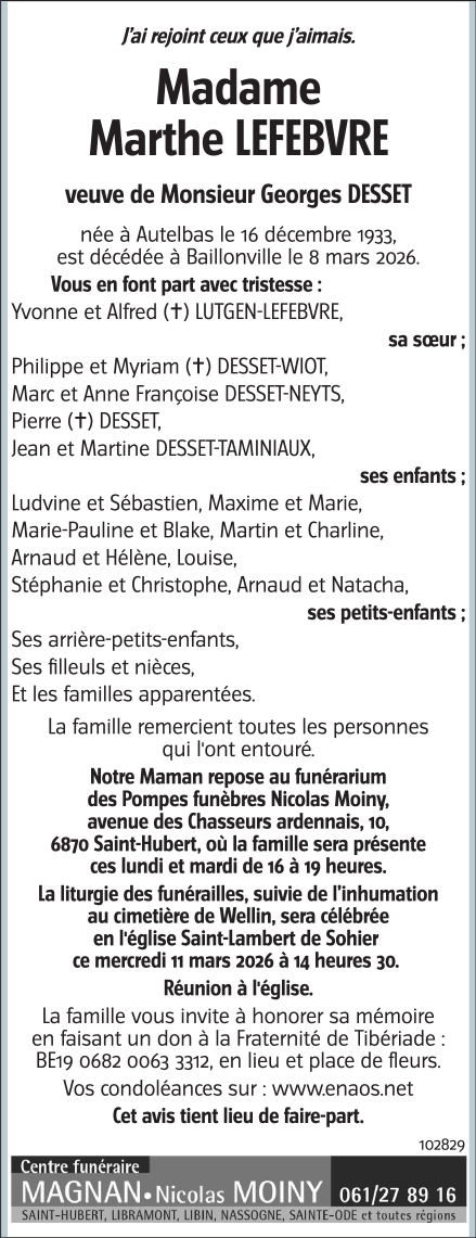 Décédée à Baillonville (5377, Belgique) le dimanche 8 mars 2026 à l'âge de 92 ans