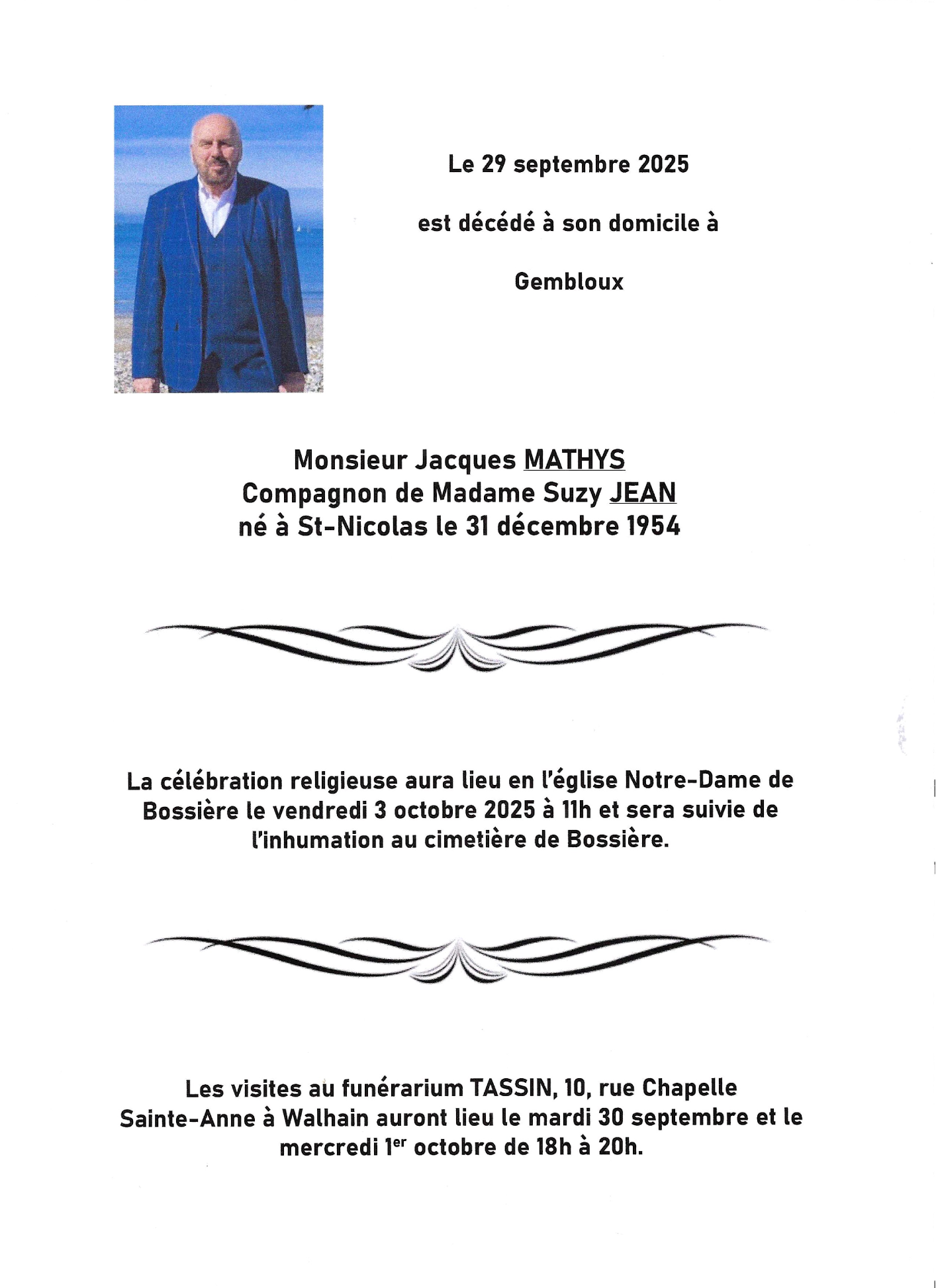 Décédé à Gembloux (5030, Belgique) le lundi 29 septembre 2025 à l'âge de 70 ans