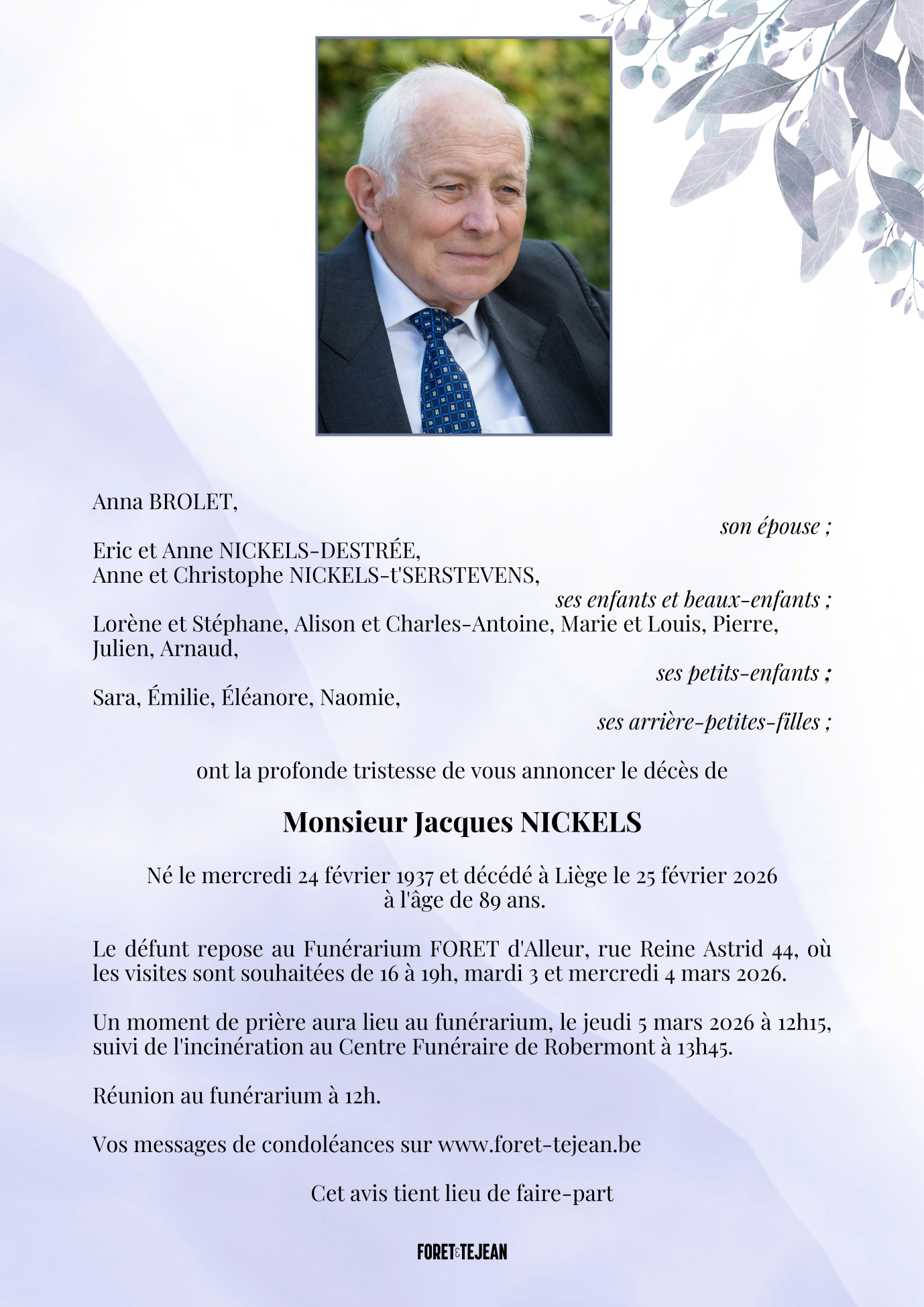 Fallecido en Liège (4000, Bélgica) el miércoles, 25 de febrero de 2026 a la edad de 89 años