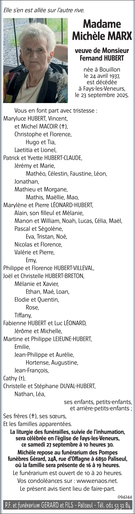 Died in Fays-les-Veneurs (6856, Belgium) on 24 September 2025 at the age of 88 years