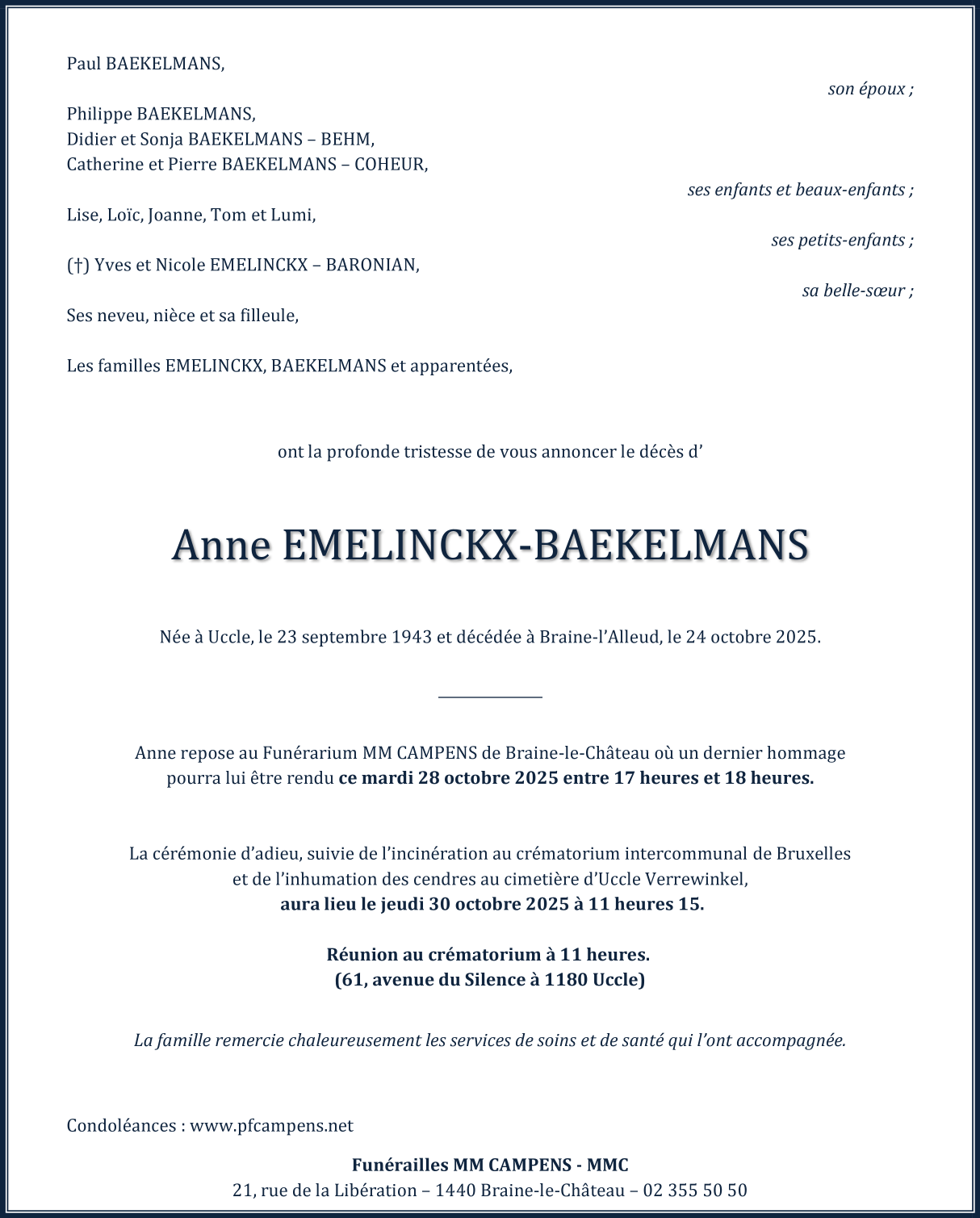 Décédée à Braine-l'Alleud (1420, Belgique) le vendredi 24 octobre 2025 à l'âge de 82 ans