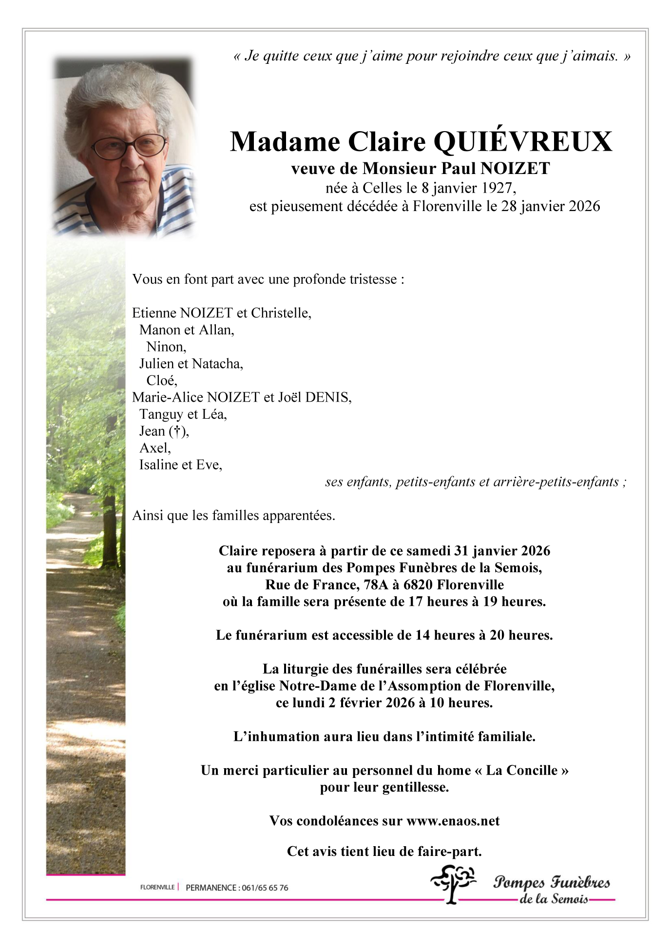 Décédée à Florenville (6820, Belgique) le mercredi 28 janvier 2026 à l'âge de 99 ans