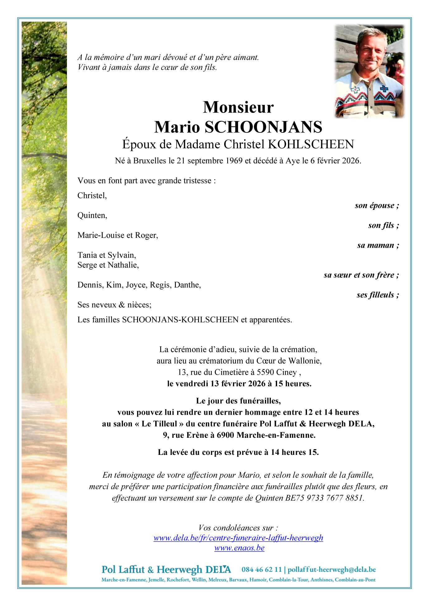 Died in Aye (6900, Belgium) on 06 February 2026 at the age of 56 years