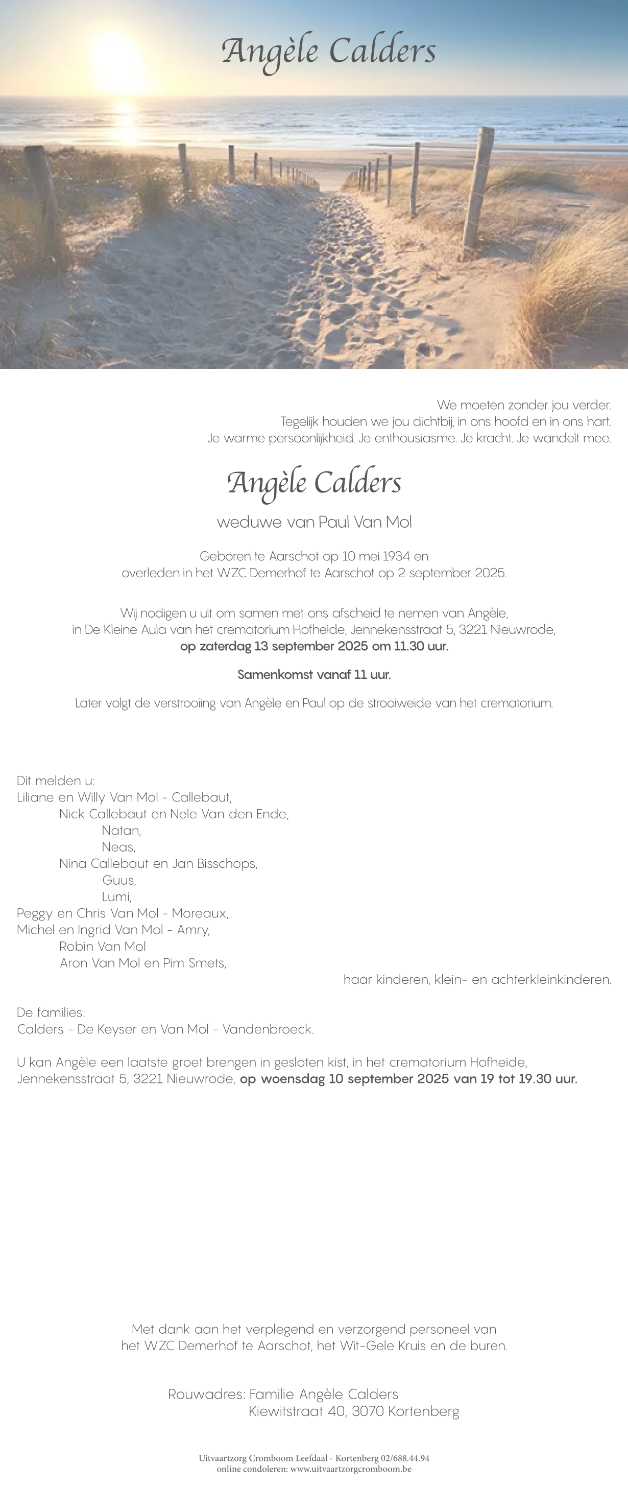 Died in Aarschot (3200, Belgium) on 02 September 2025 at the age of 91 years