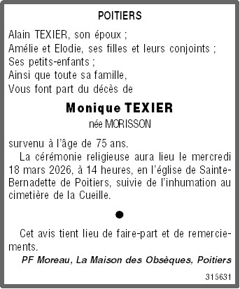 | Madame Monique TEXIER geboren MORISSONWoonachtig te Poitiers (86000, Frankrijk) Geboren te Poitiers (86000, Frankrijk) op zondag 13 augustus 1950 Overleden te Mignaloux-Beauvoir (86550, Frankrijk) op donderdag 12 maart 2026 op 75-jarige leeftijd Echtgenote van Monsieur Alain TEXIER