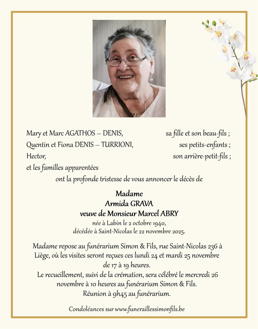 Décédée à Montegnée (4420, Belgique) le samedi 22 novembre 2025 à l'âge de 85 ans