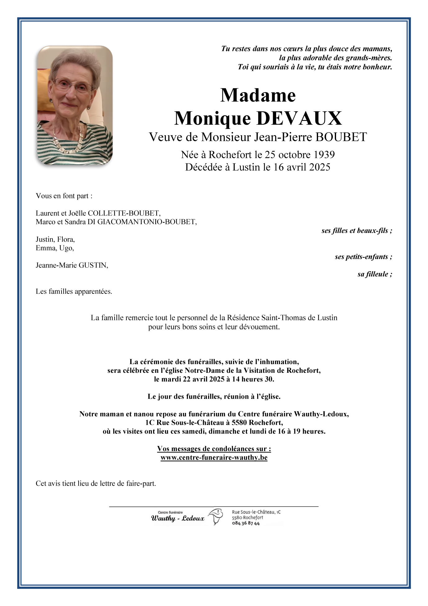 Décédée à Lustin (5170, Belgique) le mercredi 16 avril 2025 à l'âge de 85 ans
