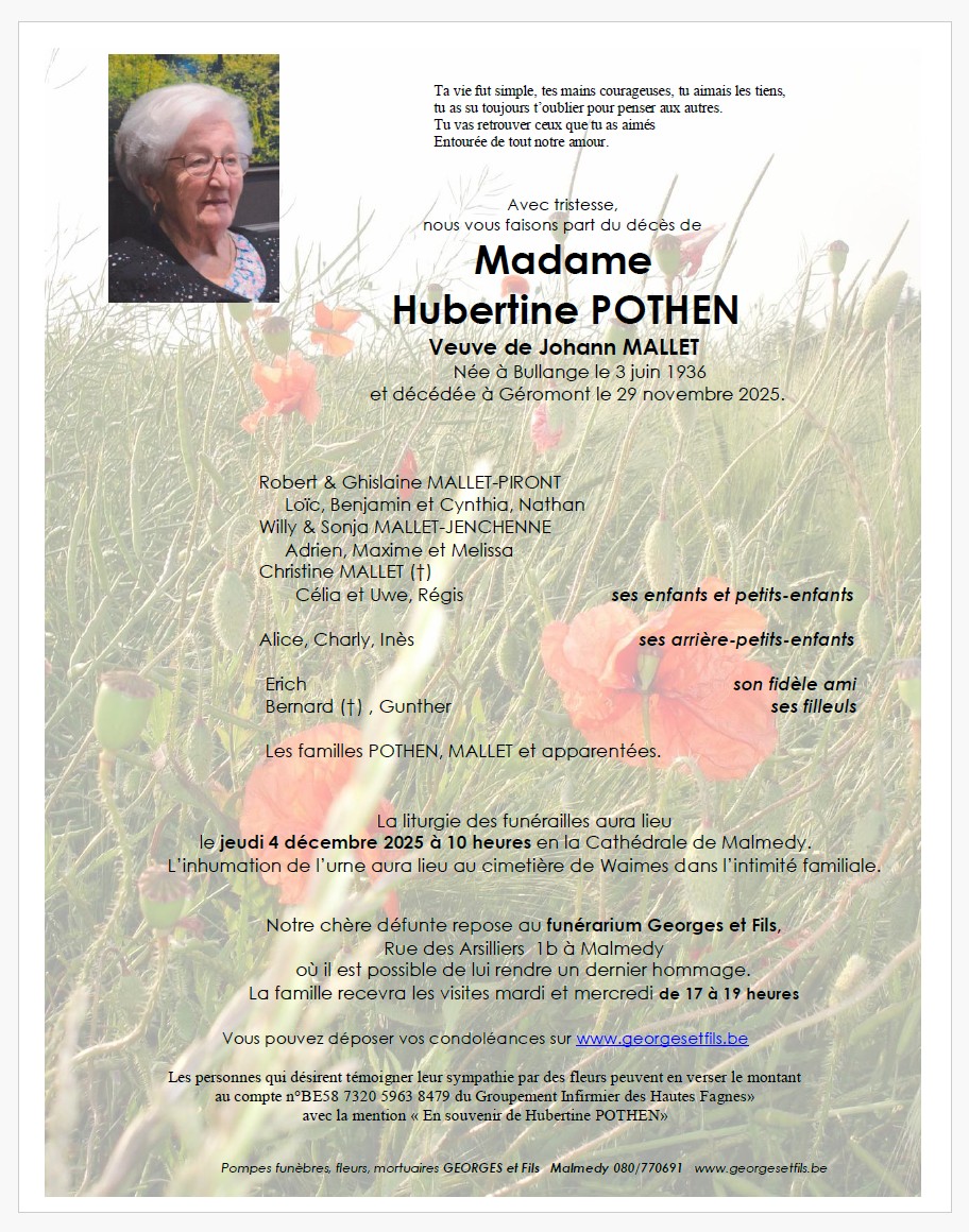 Décédée à Malmedy (4960, Belgique) le samedi 29 novembre 2025 à l'âge de 89 ans