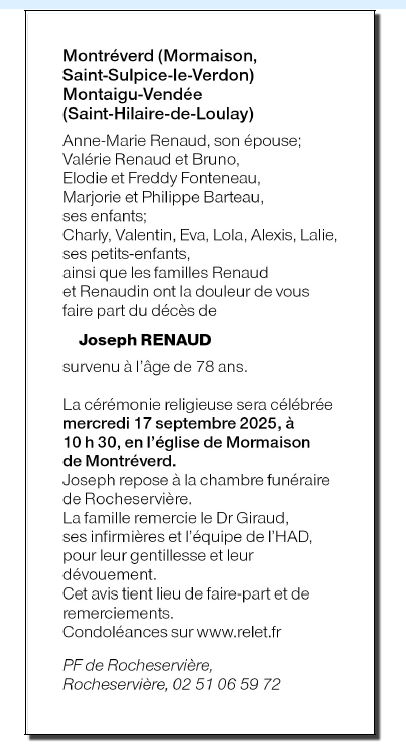 Décédé à Mormaison (85260, France) le dimanche 14 septembre 2025 à l'âge de 78 ans