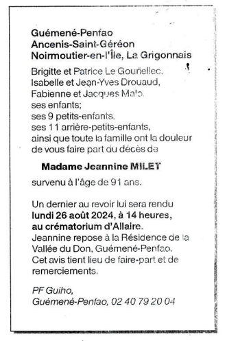 Died in Guémené-Penfao (44290, France) on 21 August 2024 at the age of 91 years