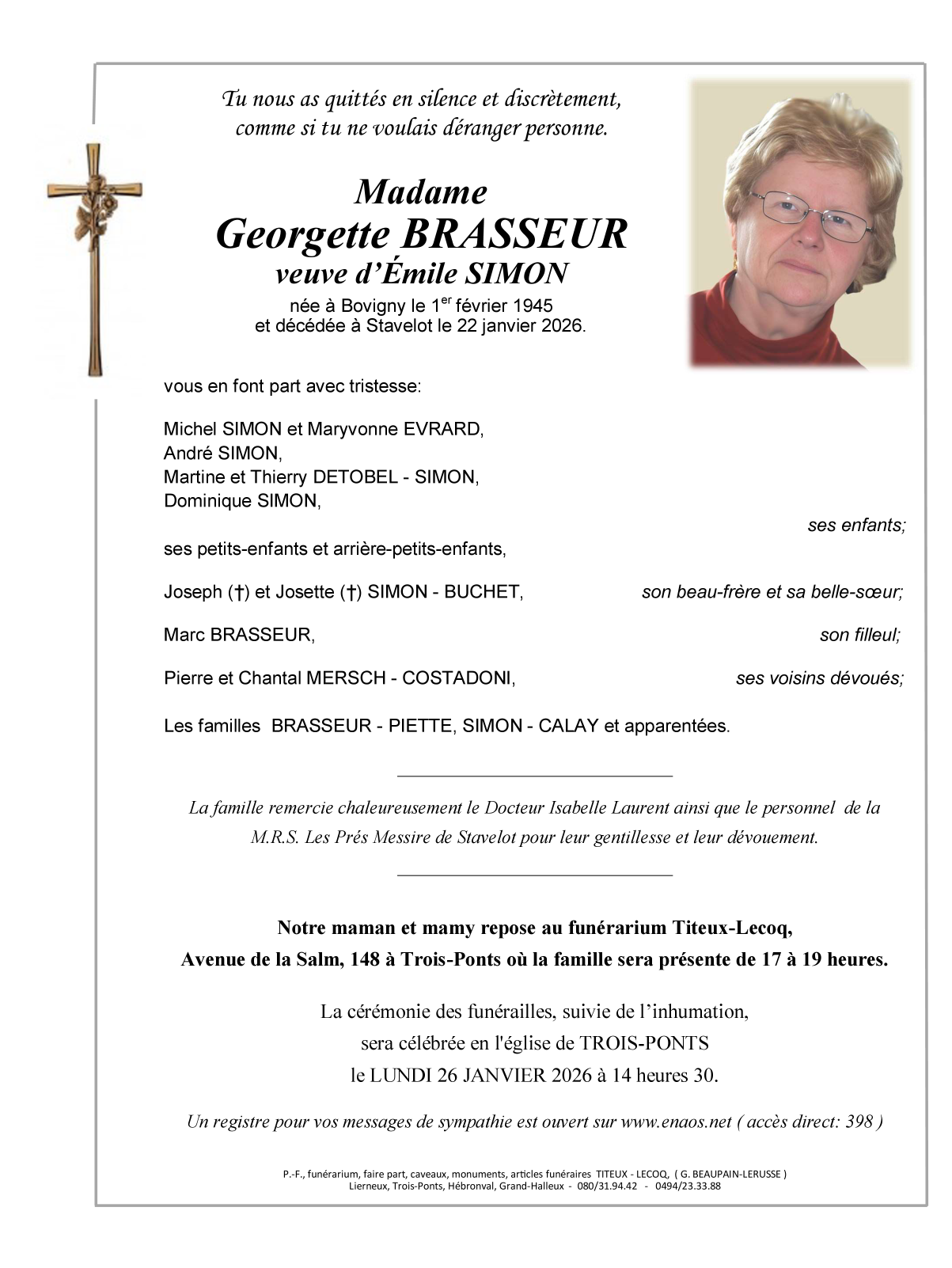 Overleden te Stavelot (4970, België) op donderdag 22 januari 2026 op 80-jarige leeftijd