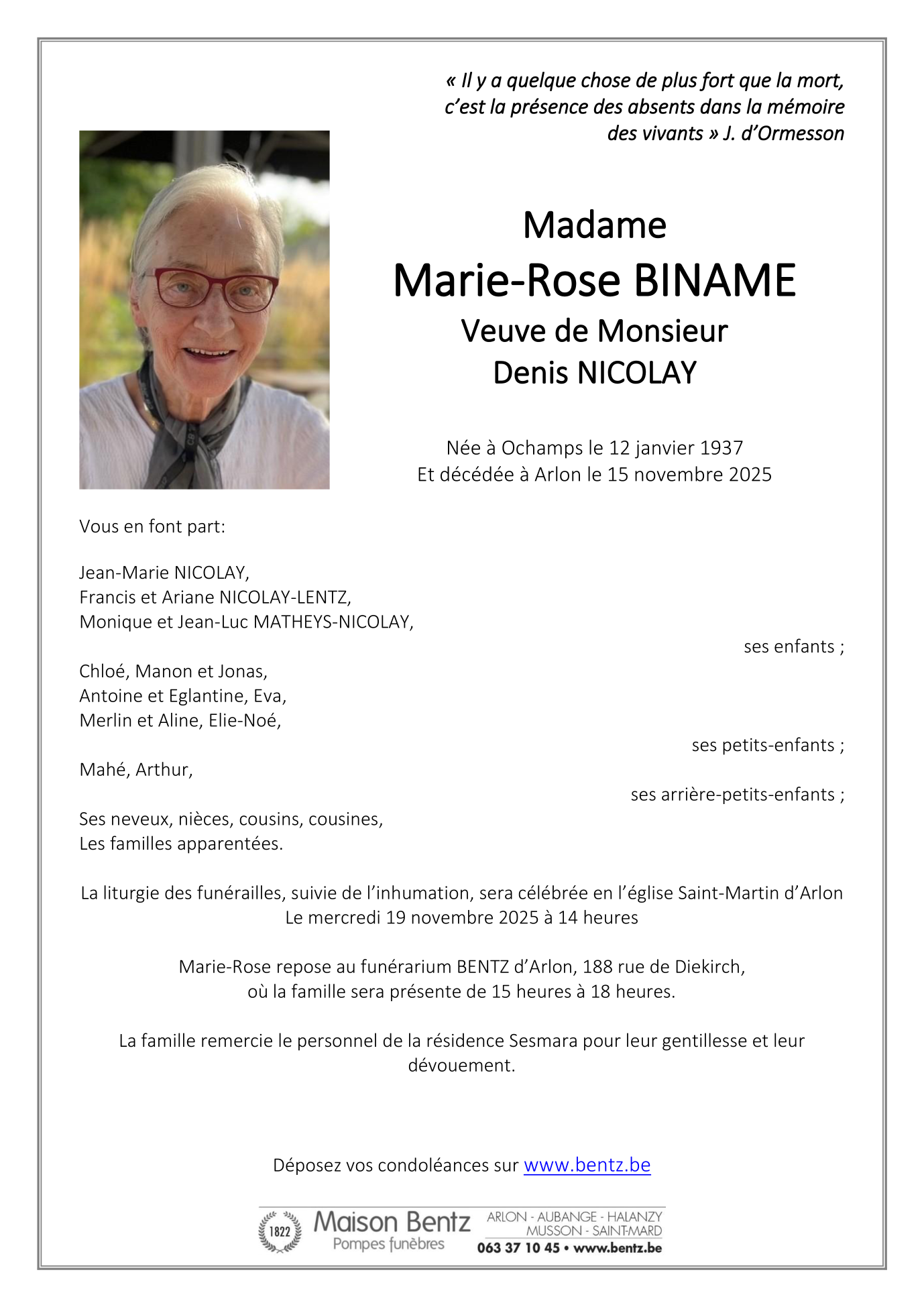 Overleden te Arlon (6700, België) op zaterdag 15 november 2025 op 88-jarige leeftijd