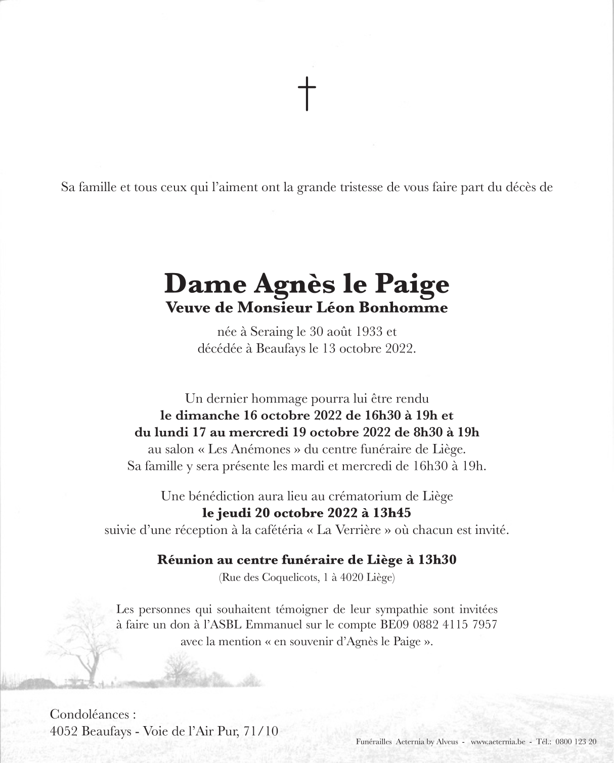 Fallecida en Beaufays (4052, Bélgica) el jueves, 13 de octubre de 2022 a la edad de 89 años