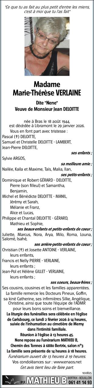 Décédée à Libramont (6800, Belgique) le vendredi 30 janvier 2026 à l'âge de 81 ans