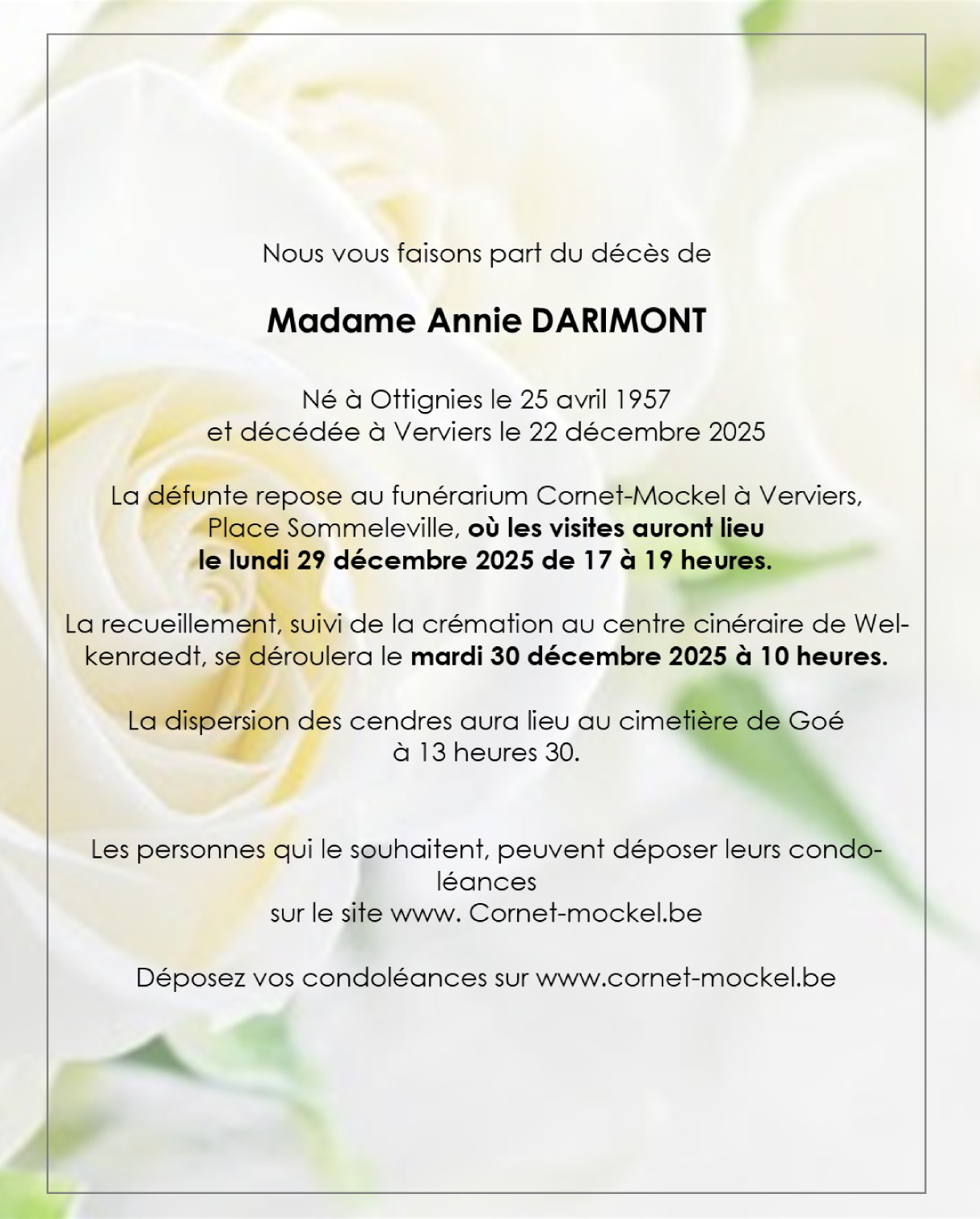 Fallecida en Verviers (4800, Bélgica) el lunes, 22 de diciembre de 2025 a la edad de 68 años