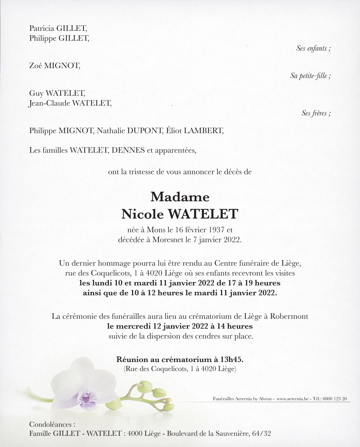 Died in Moresnet (4850, Belgium) on 07 January 2022 at the age of 84 years