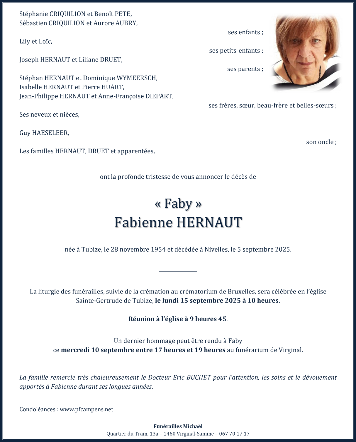 Overleden te Nivelles (1400, België) op vrijdag 5 september 2025 op 70-jarige leeftijd
