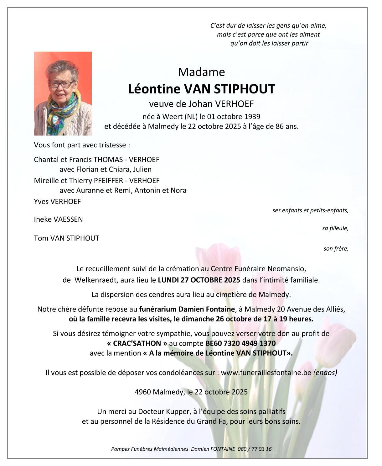 Décédée à Malmedy (4960, Belgique) le mercredi 22 octobre 2025 à l'âge de 86 ans