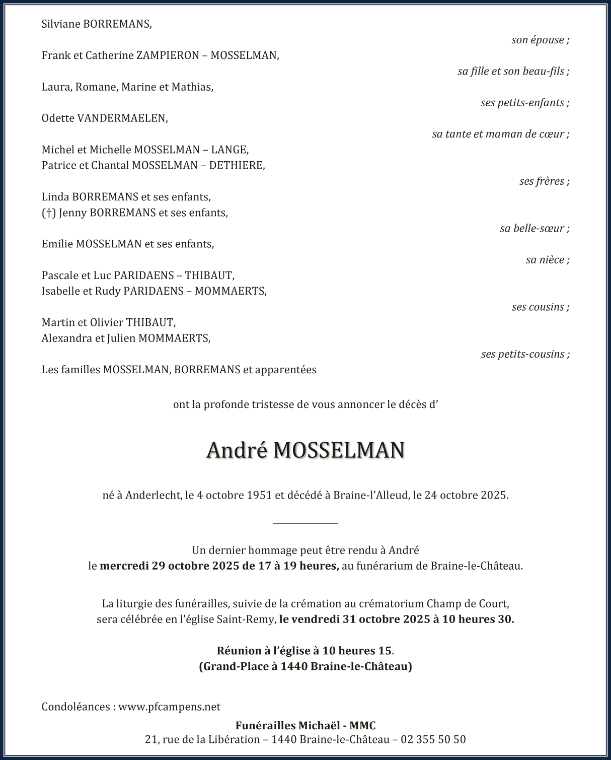 Overleden te Braine-l'Alleud (1420, België) op vrijdag 24 oktober 2025 op 74-jarige leeftijd