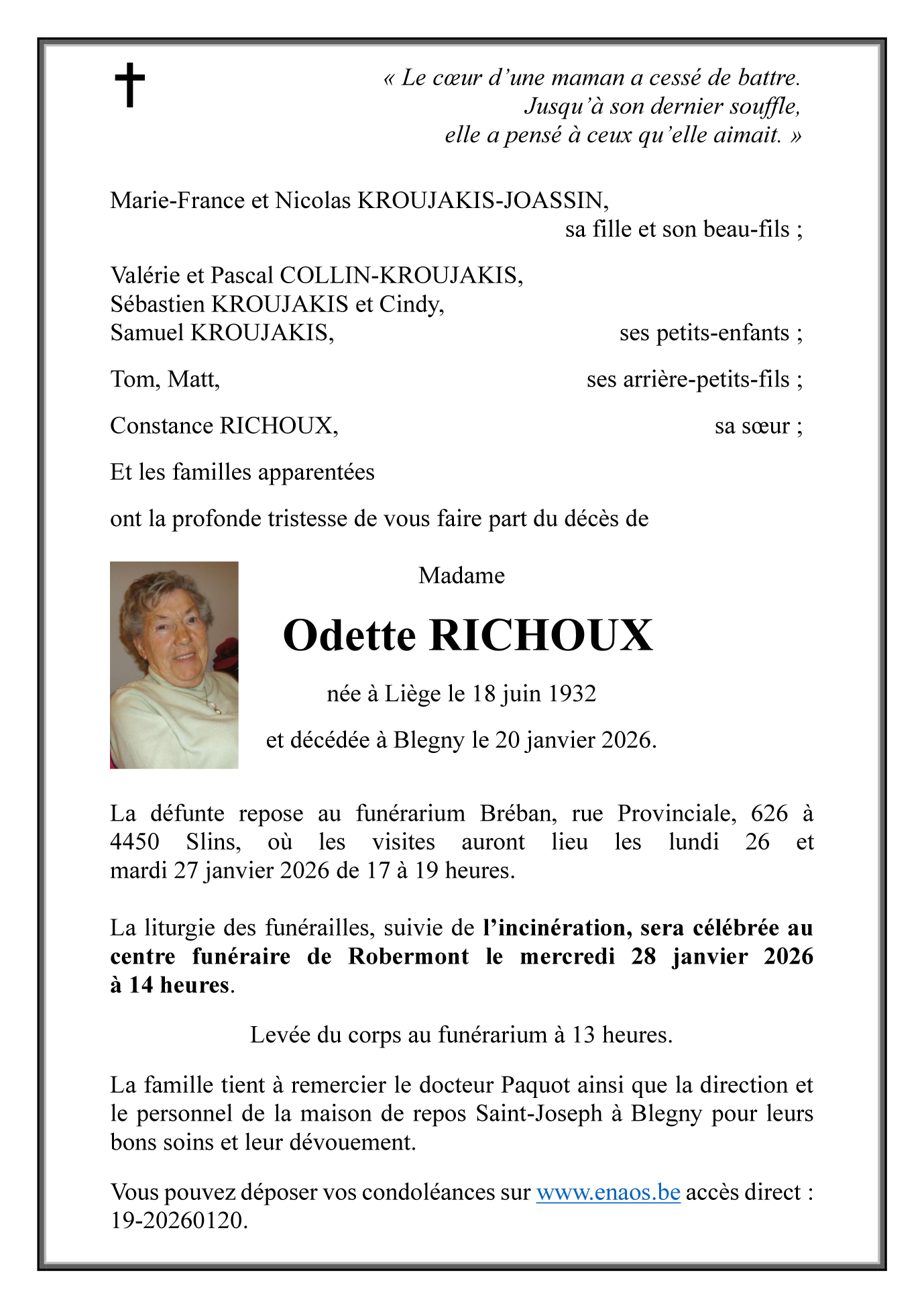 Décédée à Blegny (4670, Belgique) le mardi 20 janvier 2026 à l'âge de 93 ans