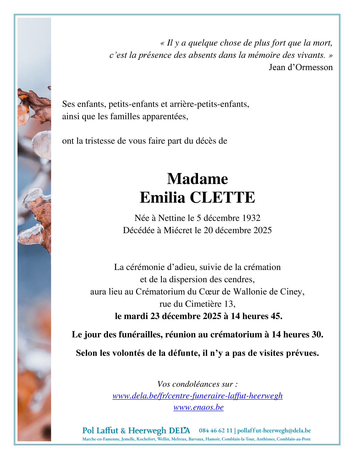 Fallecida en Miécret (5376, Bélgica) el sábado, 20 de diciembre de 2025 a la edad de 93 años