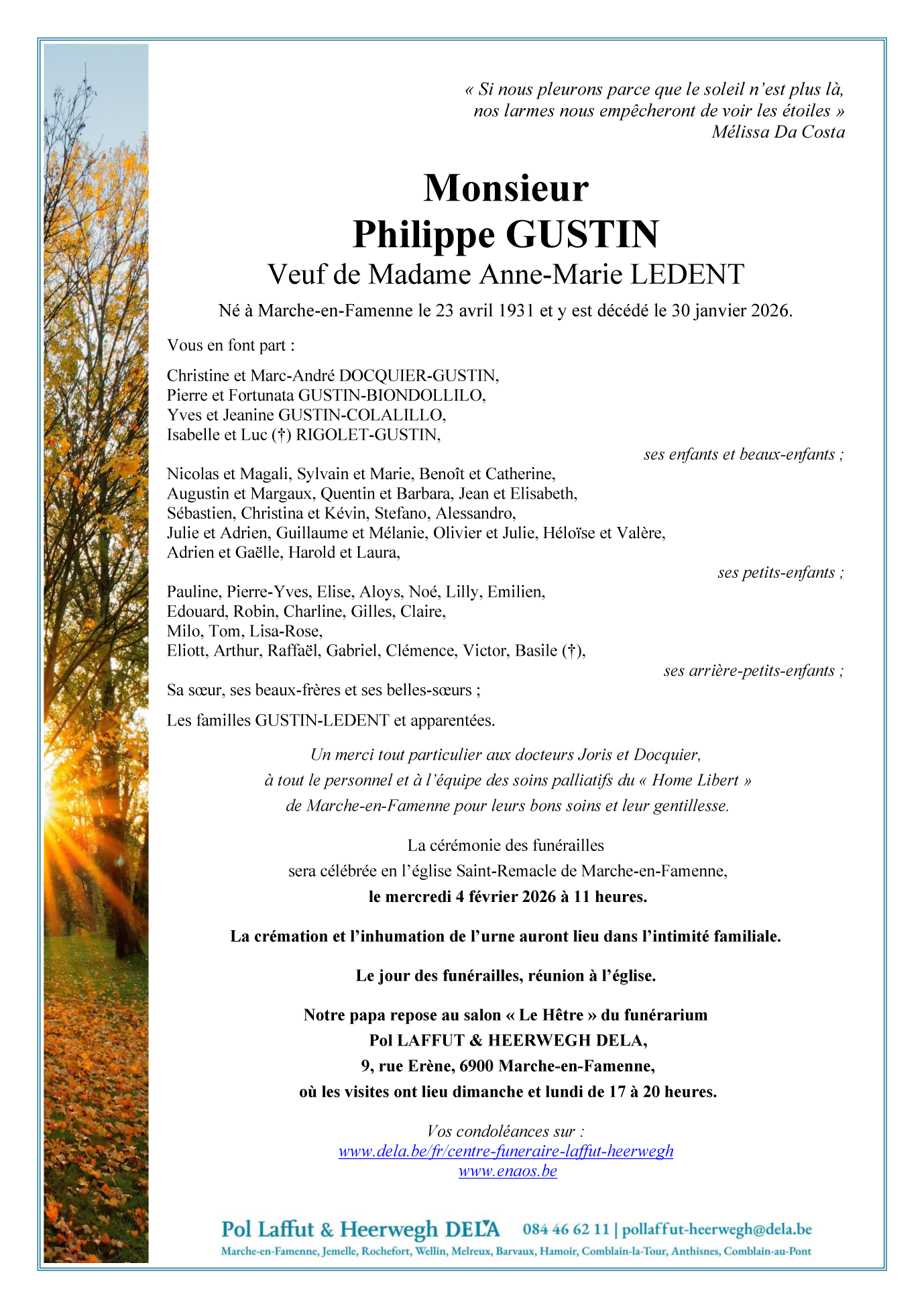 Overleden te Marche-en-Famenne (6900, België) op vrijdag 30 januari 2026 op 94-jarige leeftijd