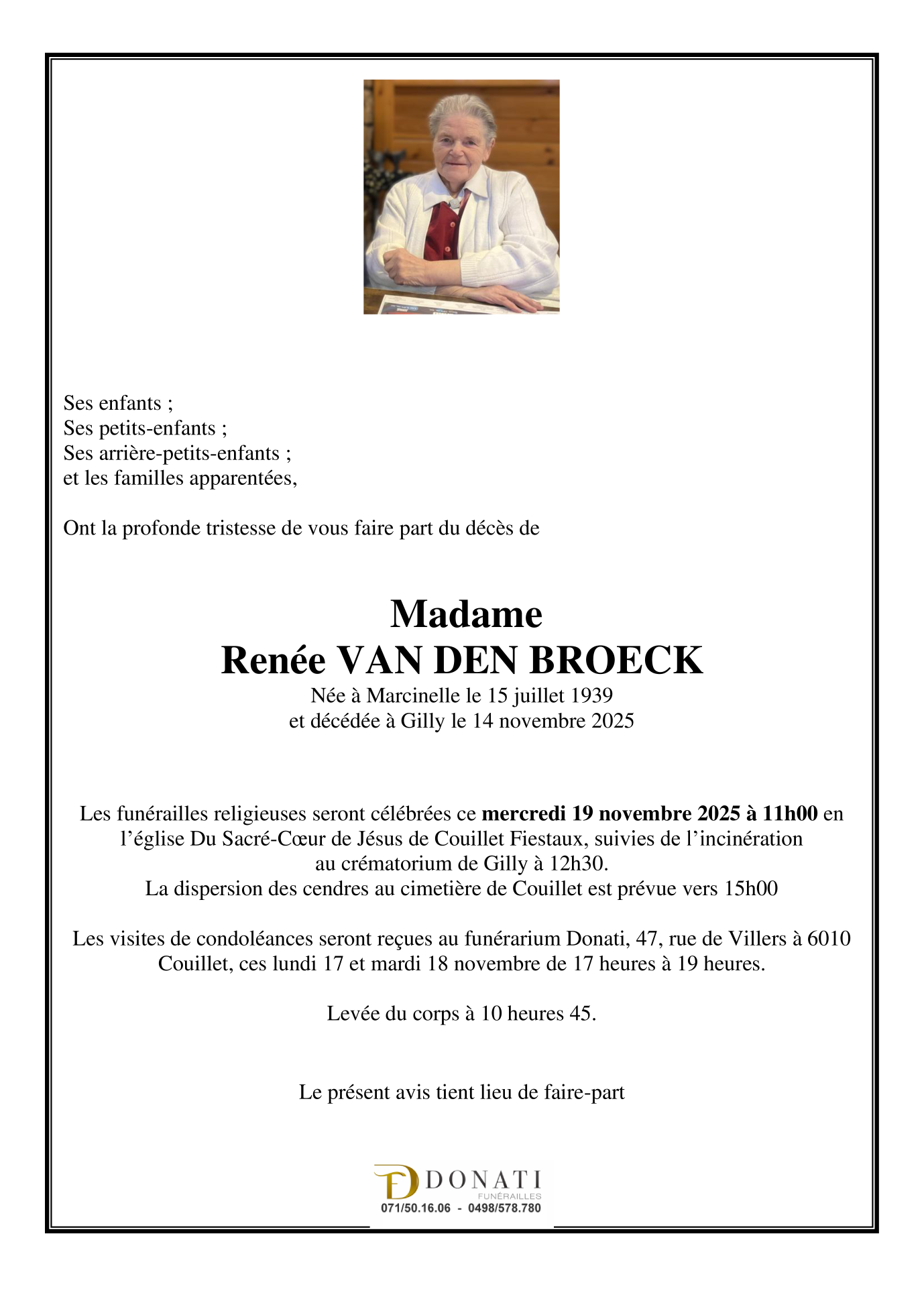 Décédée à Gilly (6060, Belgique) le vendredi 14 novembre 2025 à l'âge de 86 ans