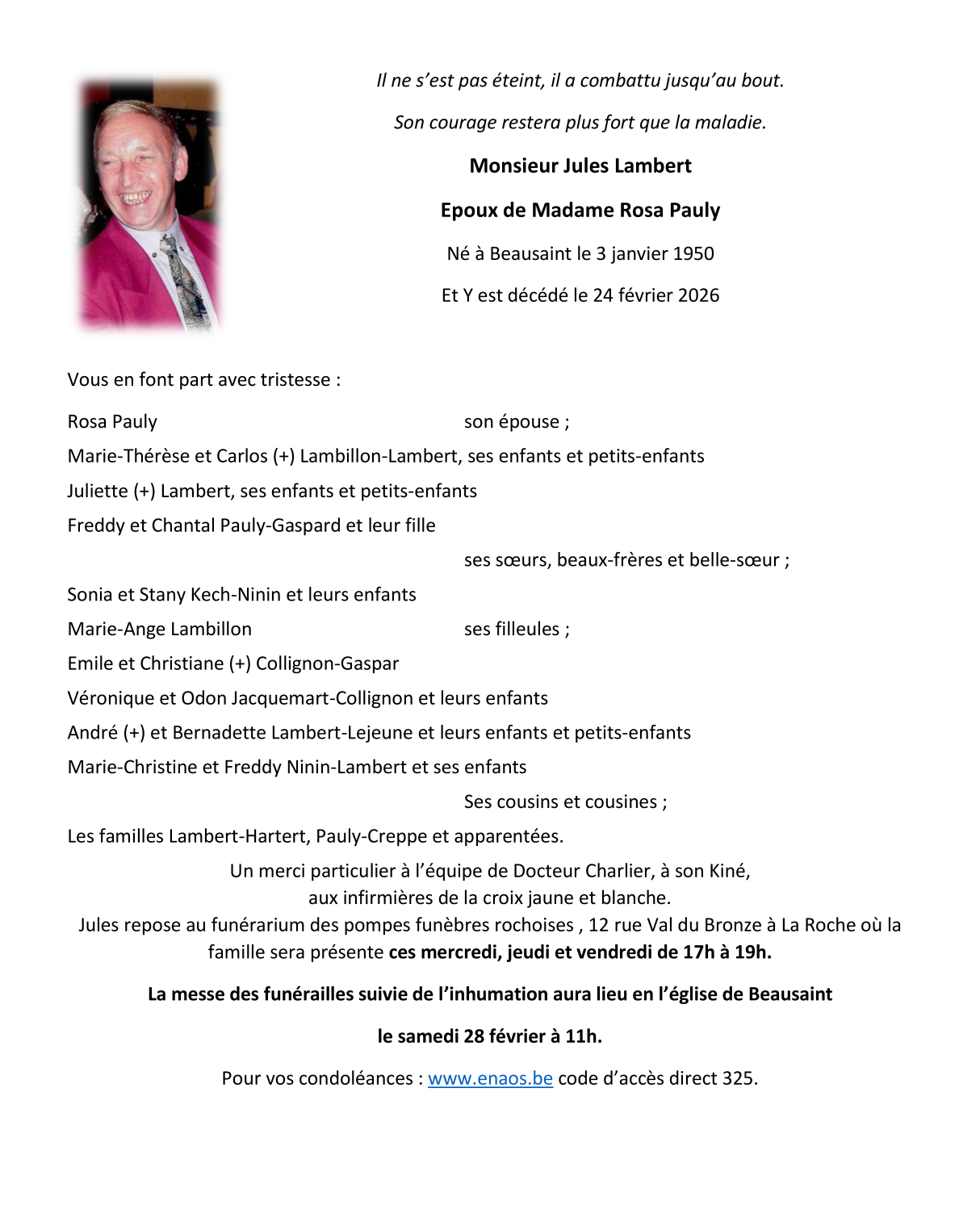 Décédé à Beausaint (6980, Belgique) le mardi 24 février 2026 à l'âge de 76 ans