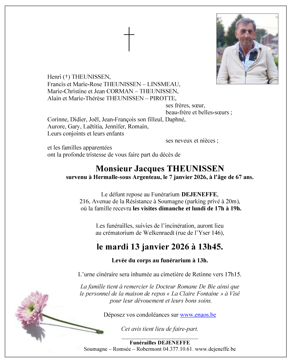 Décédé à Hermalle-sous-Argenteau (4681, Belgique) le mercredi 7 janvier 2026 à l'âge de 67 ans
