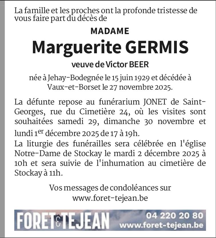 Décédée à Vaux-et-Borset (4530, Belgique) le jeudi 27 novembre 2025 à l'âge de 96 ans