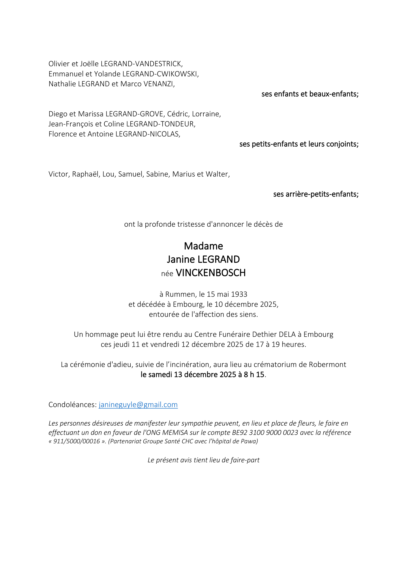 Décédée à Embourg (4053, Belgique) le mercredi 10 décembre 2025 à l'âge de 92 ans