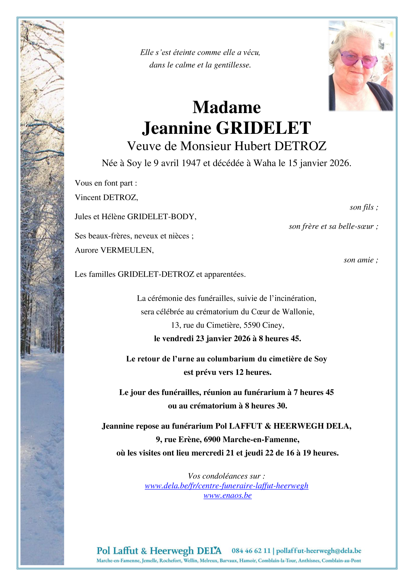 Fallecida en Waha (6900, Bélgica) el jueves, 15 de enero de 2026 a la edad de 78 años