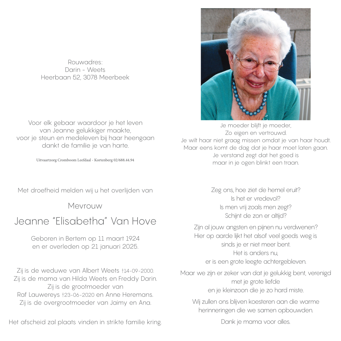 Died in Bertem (3060, Belgium) on 22 January 2025 at the age of 100 years