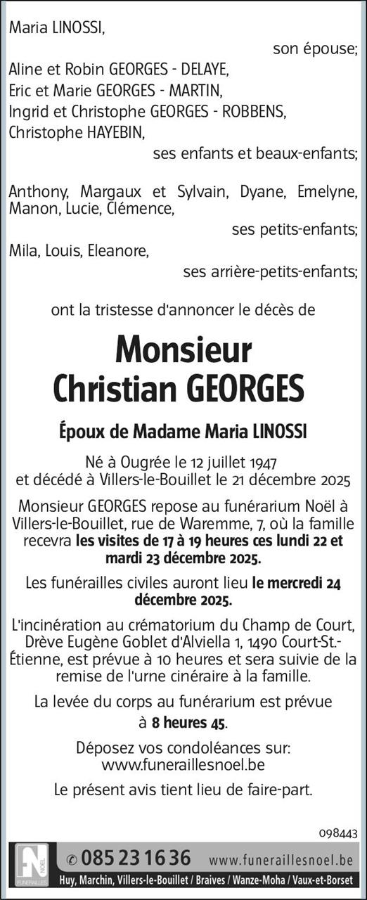Fallecido en Villers-le-Bouillet (4530, Bélgica) el domingo, 21 de diciembre de 2025 a la edad de 78 años