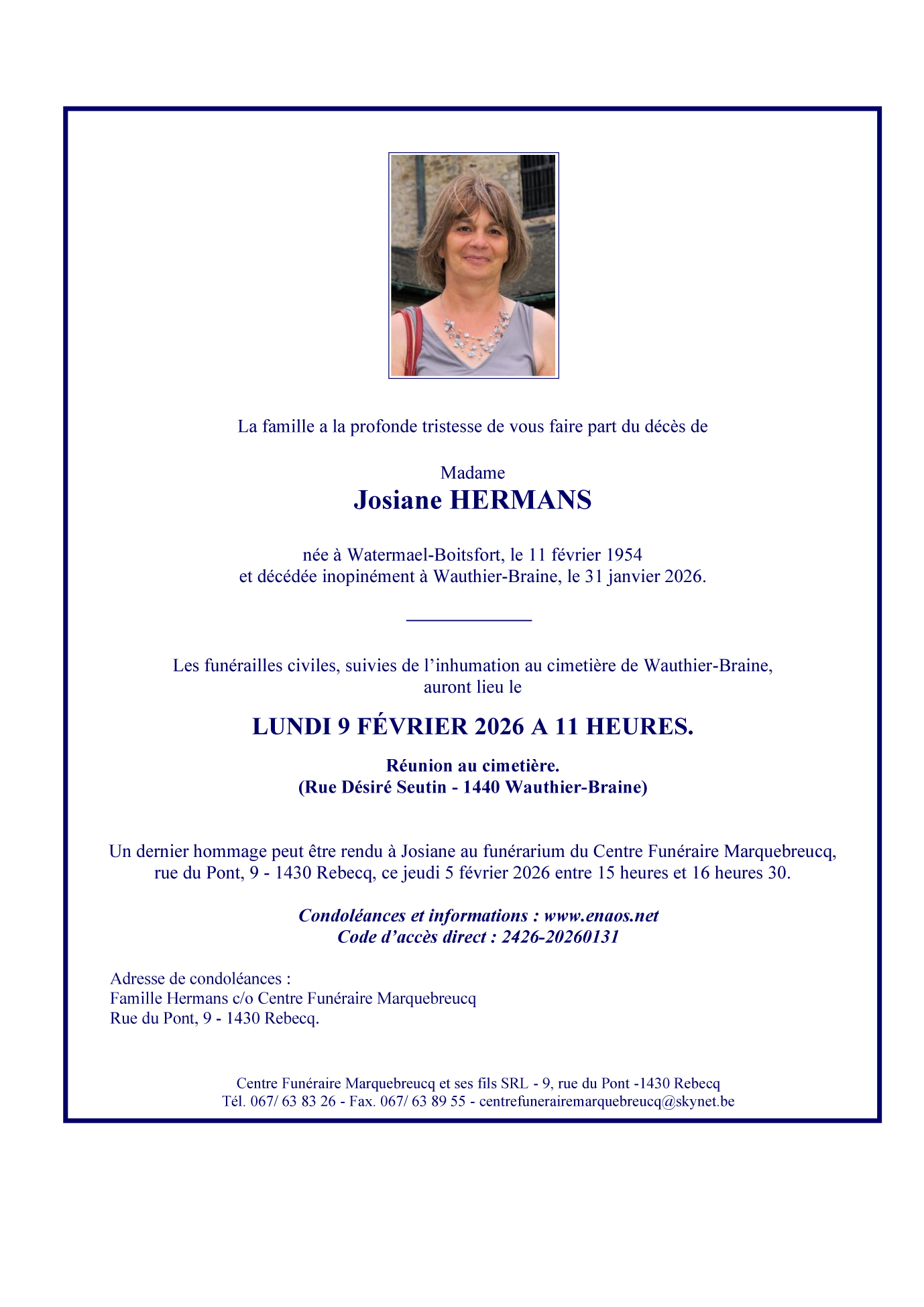 Fallecida en Wauthier-Braine (1440, Bélgica) el sábado, 31 de enero de 2026 a la edad de 71 años