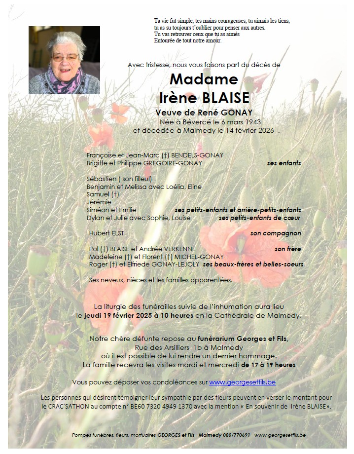 Fallecida en Malmedy (4960, Bélgica) el sábado, 14 de febrero de 2026 a la edad de 82 años