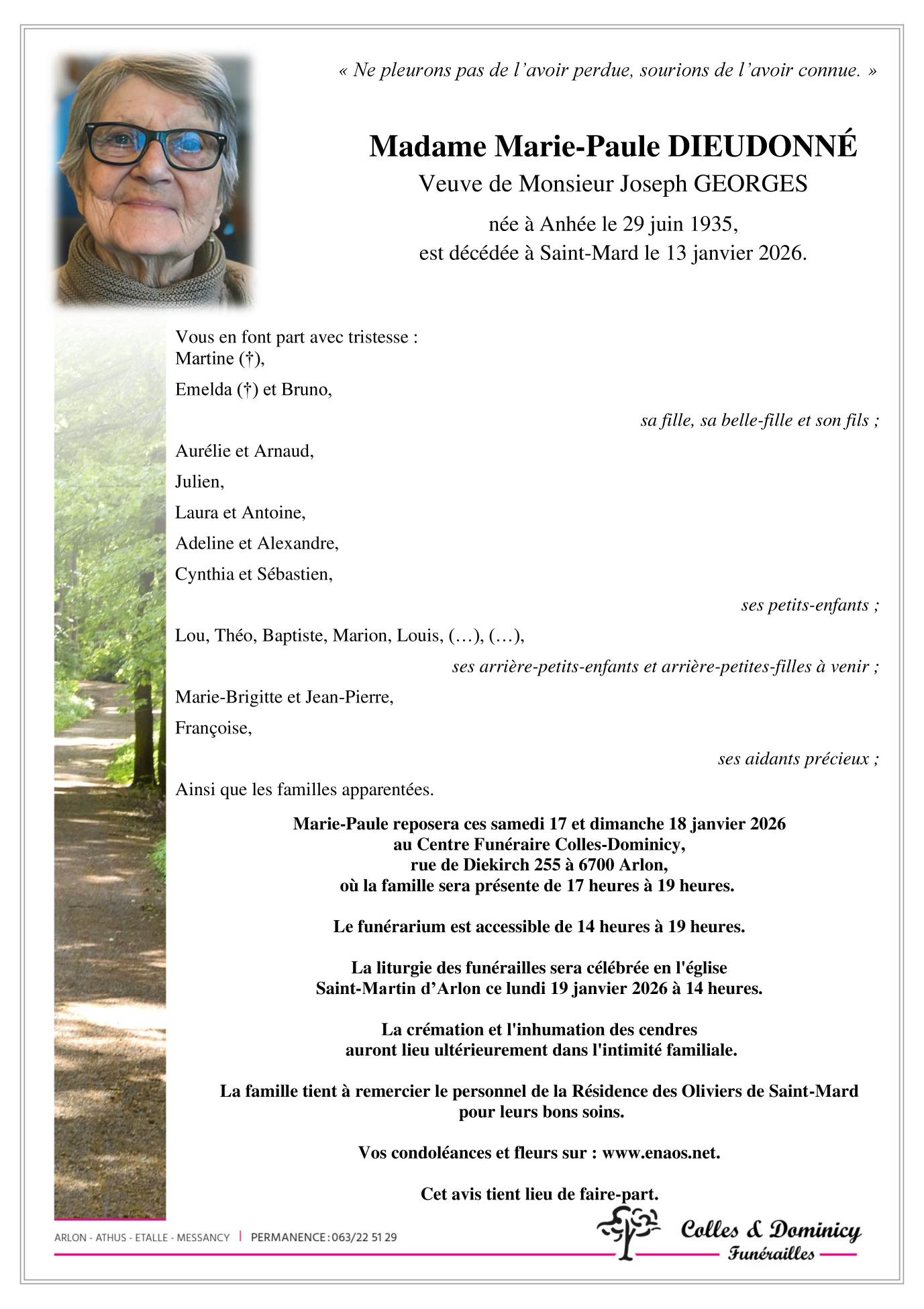 Fallecida en Saint-Mard (6762, Bélgica) el martes, 13 de enero de 2026 a la edad de 90 años