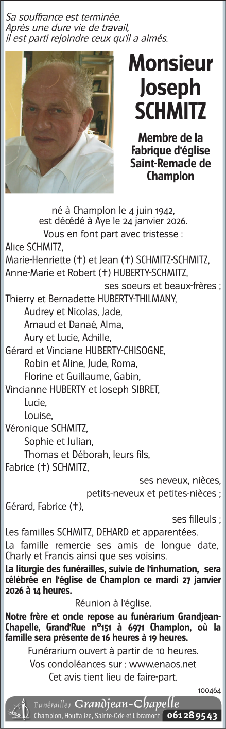 Died in Aye (6900, Belgium) on 24 January 2026 at the age of 83 years