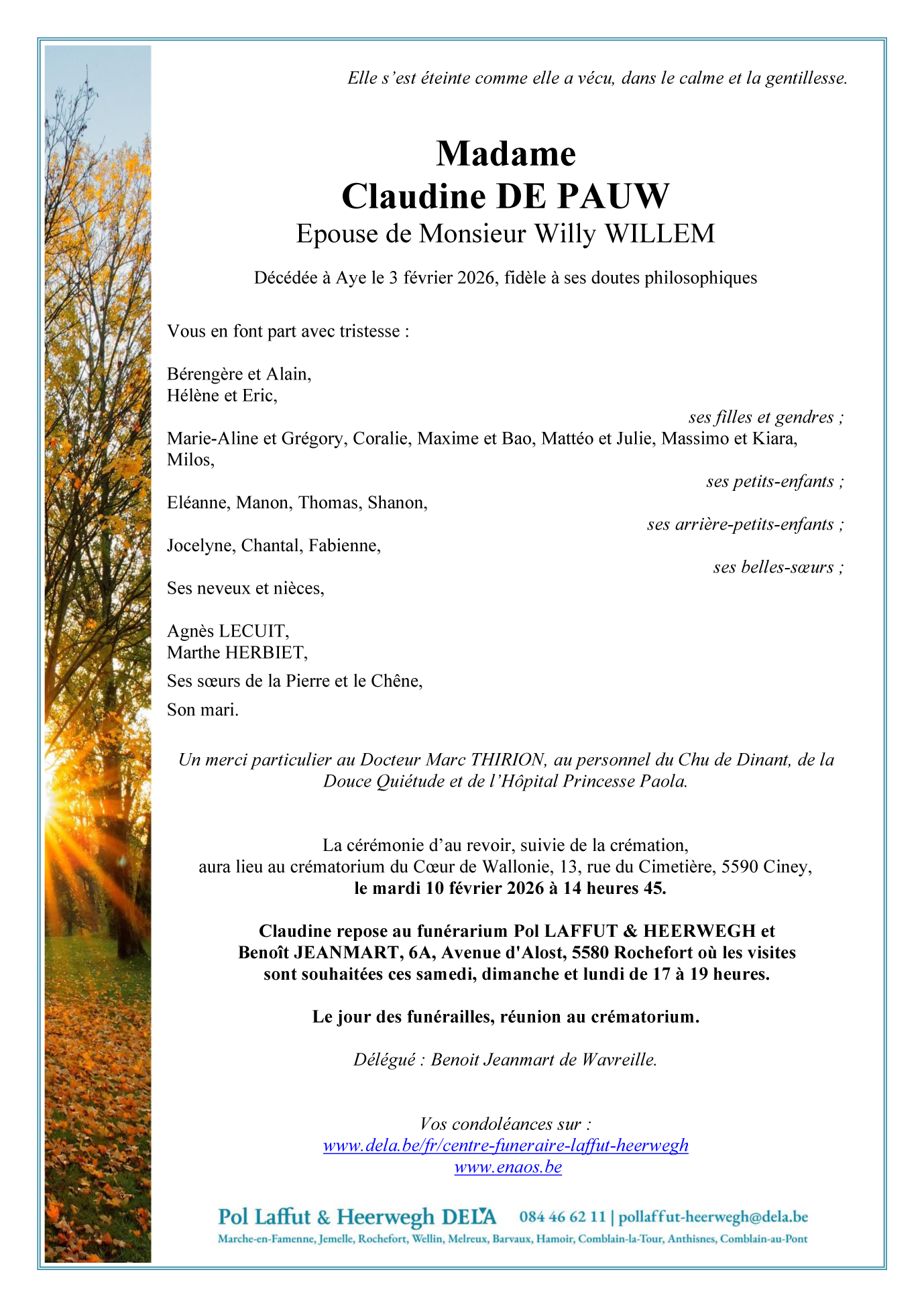 Fallecida en Aye (6900, Bélgica) el martes, 3 de febrero de 2026 a la edad de 84 años