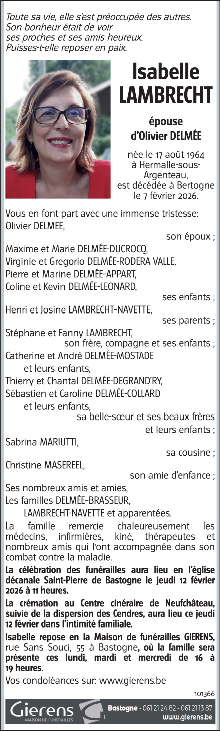 Décédée à Bertogne (6687, Belgique) le samedi 7 février 2026 à l'âge de 61 ans